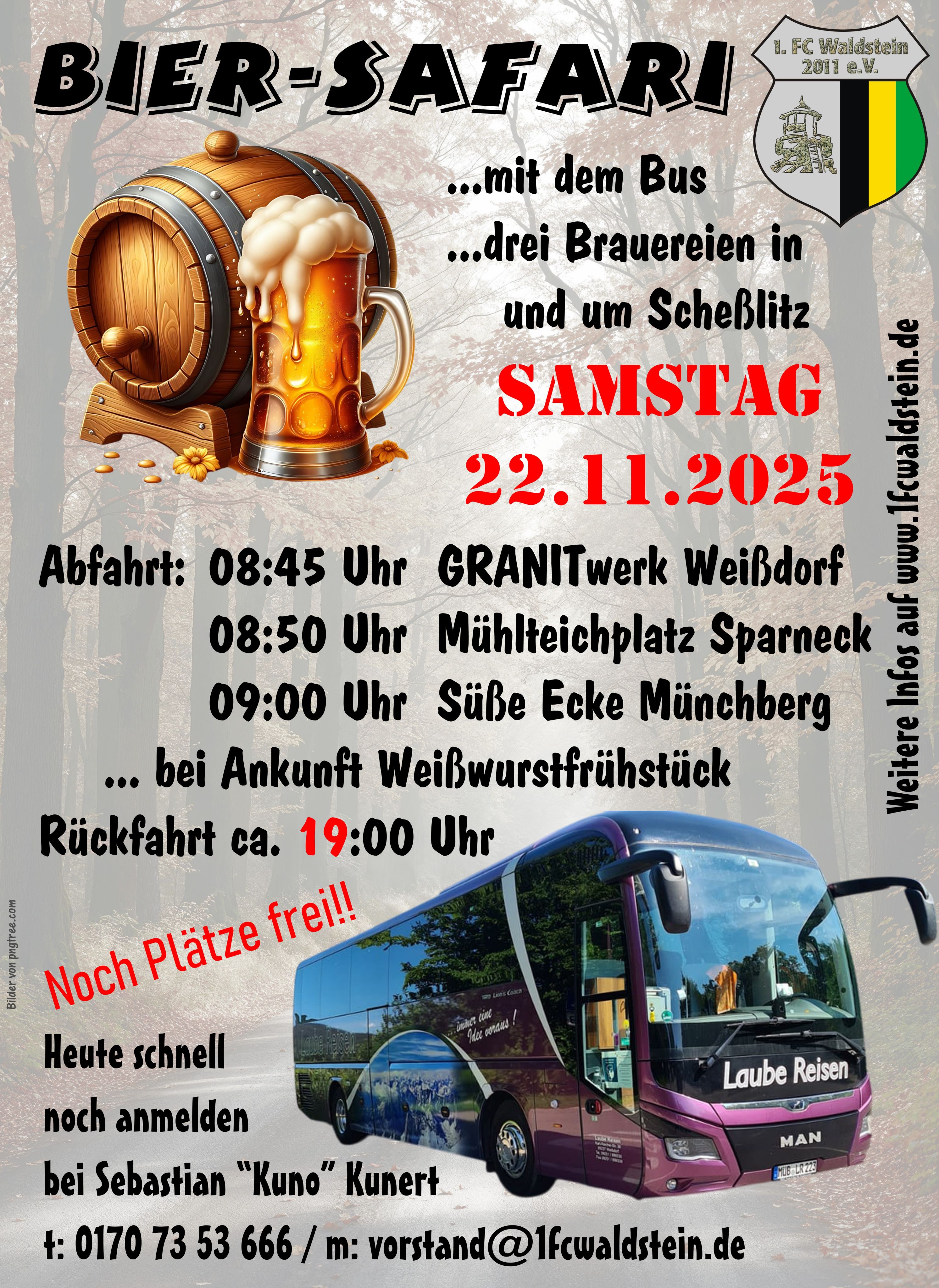 Wir definieren die Fahrt ins Blaue neu - Gaudi und Bierkultur pur! Nach 2012 veranstaltet der 1.FC Waldstein zum zweiten Mal eine