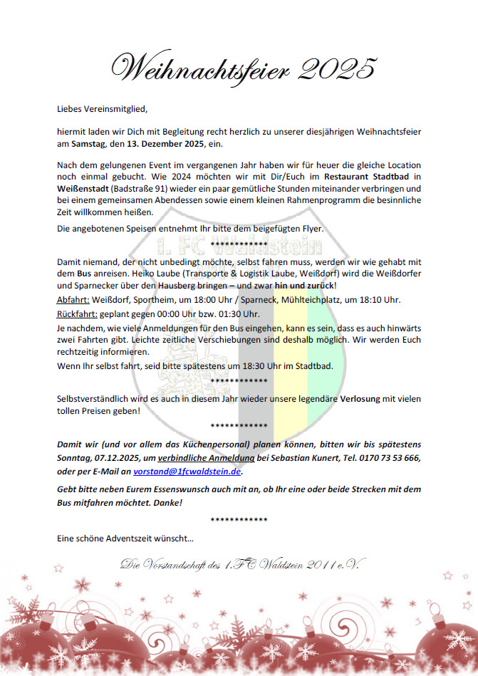Alle Einzelheiten findet Ihr im Einladungsschreiben. Wir freuen uns auf zahlreiche Teilnahme! Bitte meldet Euch verbindlich bis Sonntag, 07.12., an.