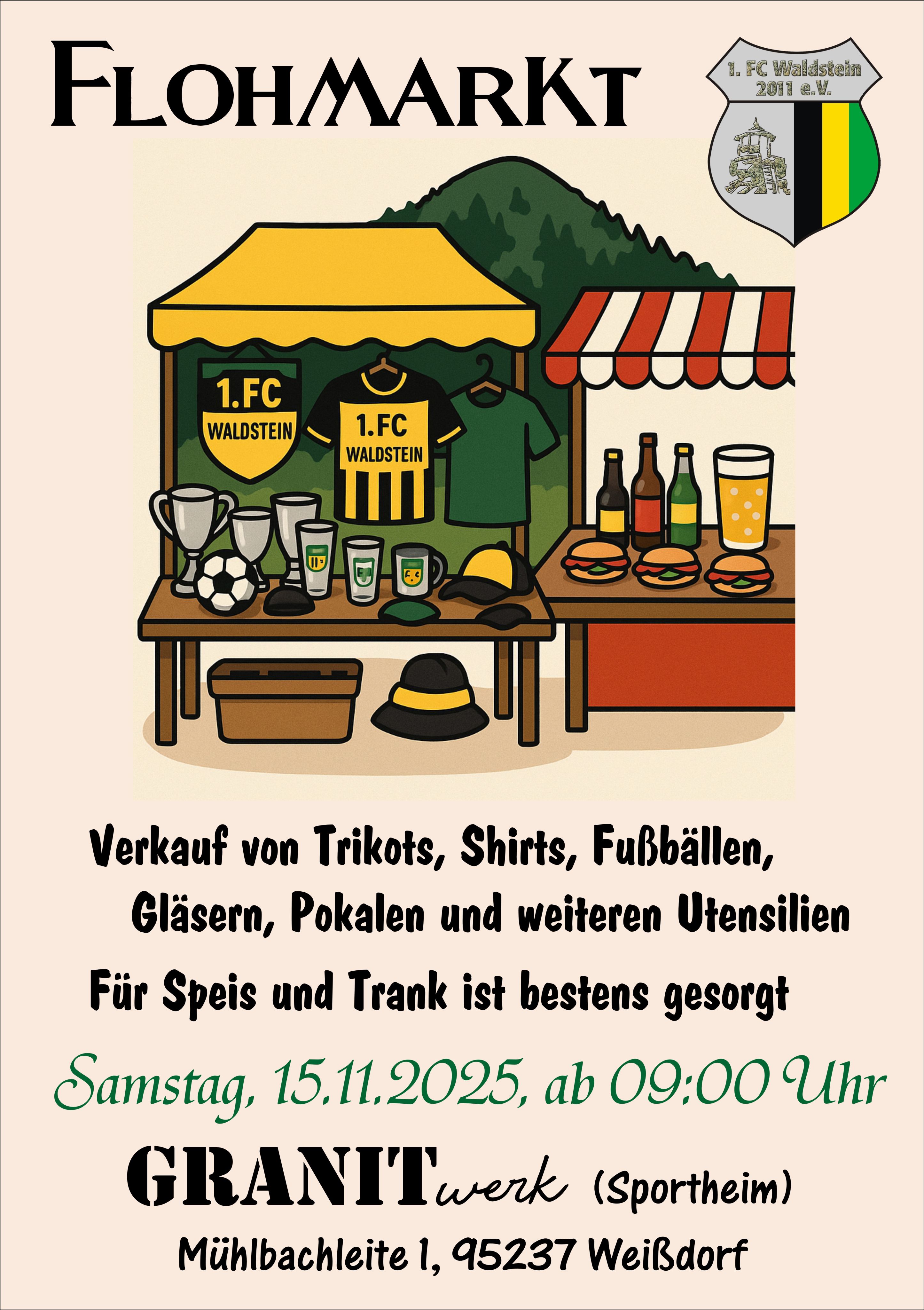 Am Samstag, 15.11.2025, werden wir unseren lange beabsichtigten Flohmarkt veranstalten. Ab 09:00 Uhr gehen viele Trikots, Shirts, Fußbälle, Gläser, Pokale und weitere Utensilien in den Verkauf. Geplant ist die Aktion auf der Terrasse unterhalb des Sportheims in Weißdorf, aber je nach Wetterlage werden wir kurzfristig reagieren.