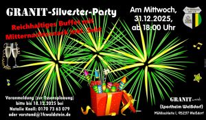Im und ums GRANITwerk möchten wir mit Euch das alte Jahr ausklingen lassen und das neue begrüßen, siehe Flyer! Für Speis und Trank wird ausreichend gesorgt sein.